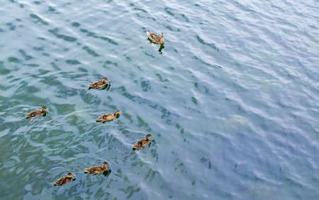 Wild duck with chicks swims in the pond. Mother Duck and her ducklings. Blurred background. Selective focus.