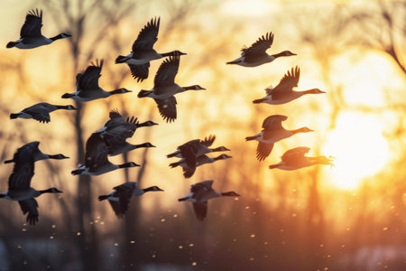 Flock of Canada Geese silhouetted against a sunset as they fly south during autumn migration