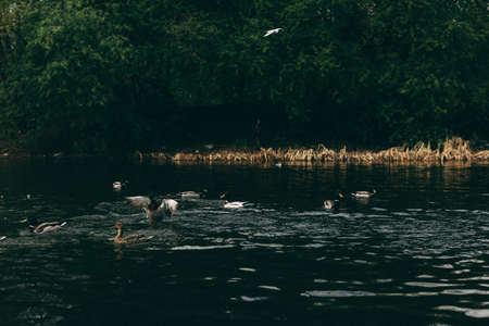 Ducks with feathers covered in oil in water polluted with waste and debris. The problem of waste water discharge and oil spills in lakes, rivers, seas and oceans - habitat of seabirds.