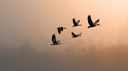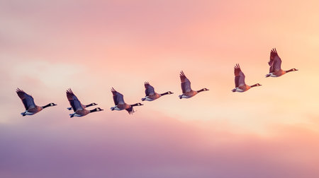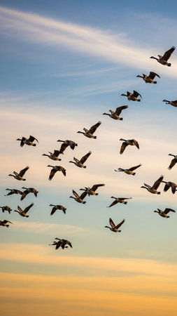 A flock of geese flying in a V-formation, their honking echoing through the sky.