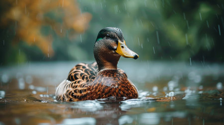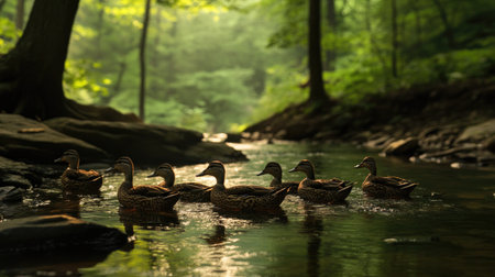 Ducks swimming peacefully in a forest stream during autumn. Golden sunlight filters through the trees, creating a serene atmosphere.
