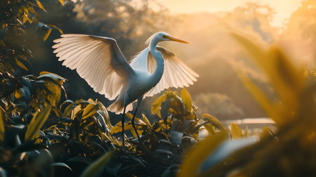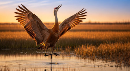 A stunning duck gracefully spreads its wings in a serene pond at sunset, creating a beautiful silhouette against the golden light, capturing the essence of tranquility in nature.