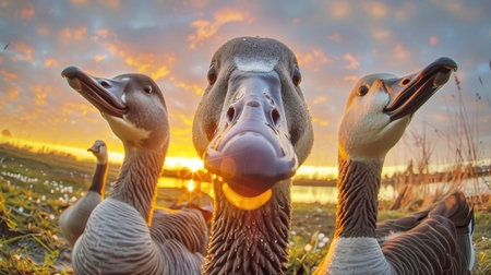 A heartwarming scene of a mother goose guiding her fluffy goslings through a peaceful landscape bathed in morning light, showcasing nature's beauty.