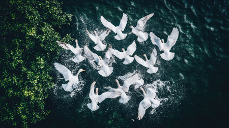A dynamic aerial view of a flock of swans taking off from a serene water surface, capturing the beauty and motion of wildlife in nature.