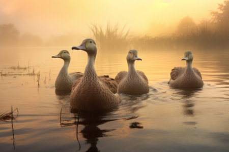 Autumn pond hosts cute duckling family portrait generated by artificial intelligence