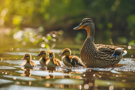 A duck and its ducklings swim across a tranquil pond. The scene features lush green lily pads and plants. Sunlight bathes the water's surface. This image is suitable for various commercial uses, including illustrations and educational content.