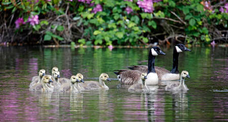 A family of geese and their goslings graze peacefully on a lush green lawn under the warm summer sun