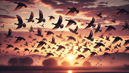 Sandhill Cranes in Flight at Sunrise Panoramic View