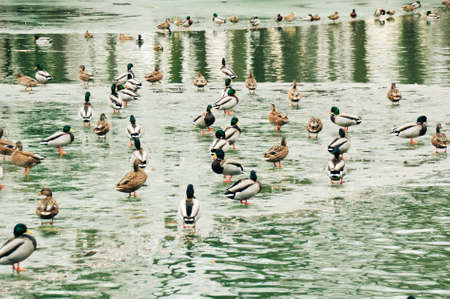 White whooper swans swimming in the nonfreezing winter lake. Altai, Russia.