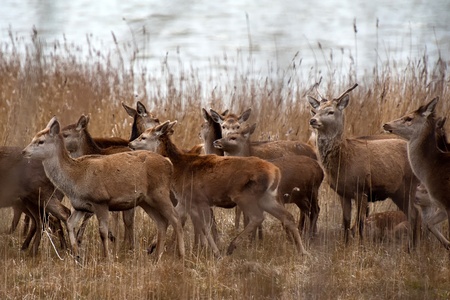 Herd of young wild deer in Scottish mountains in rainy evening.