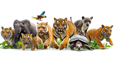 Various majestic African animals stand proudly against a white background, showcasing the lion, elephant, giraffe, zebra, and more in high detail and resolution.