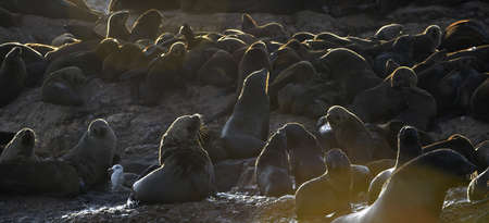 A backlit image of seals during sunrise. Colony of seals ( Cape Fur Seals ) on the rocky island in the ocean. Sunrise sky, early morning. Mossel bay. South Africa. natural habitat.