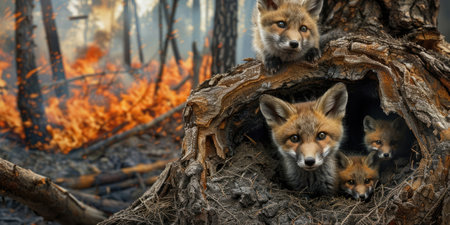 International Firefighters Day, a family of foxes peeping out of a hole against the background of a burning forest, forest fires, rescue of wild animals, destruction of forests, environmental disaster