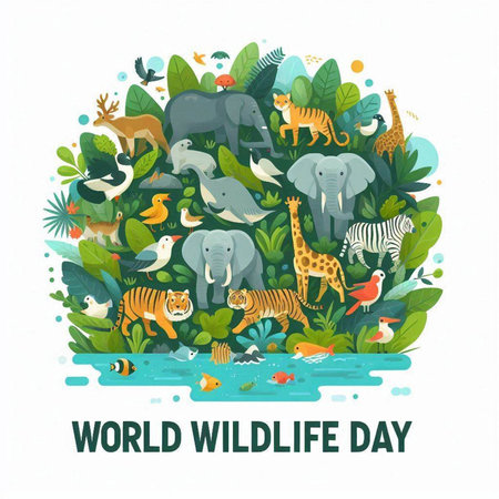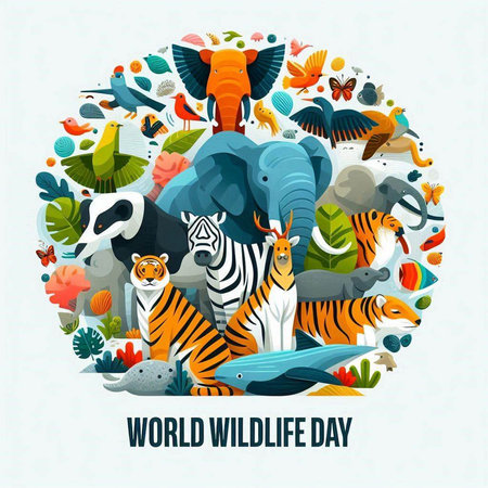 An eye catching illustration of World Wildlife Day with the animals, Earth Day concept. Created using Generative AI tools.
