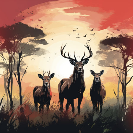 Deer silhouettes at sunset. Wild animal in natural landscape. Created with Generative AI