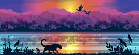 Colorful vector panorama with leopard, toucan, parrots, sunrise, river and rainforest on the background. Stock jungle landscape with palm trees, reflections in water and exotic animals for banners