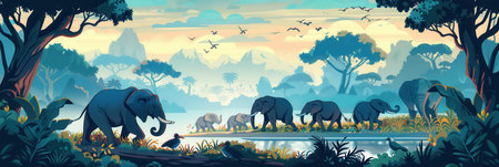 African blue landscape with animals. Vector illustration