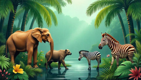 Watercolor illustration of African wildlife in a tropical setting