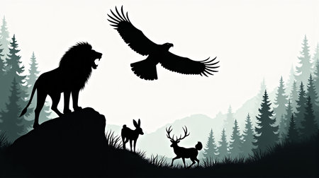 Silhouette Wildlife in Autumn Forest Landscape at Sunset Digital of various animal silhouettes in a natural environment with trees mountains and a colorful sky at dusk
