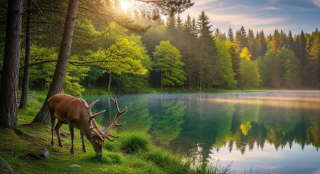 AI Generated. A deer is standing in a lush green forest by a river