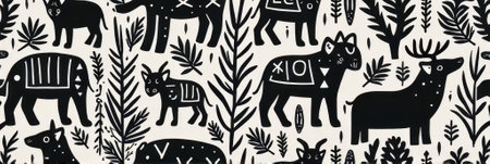 Black and white folk art with stylized animals and nature motifs. That the image is generated using AI.