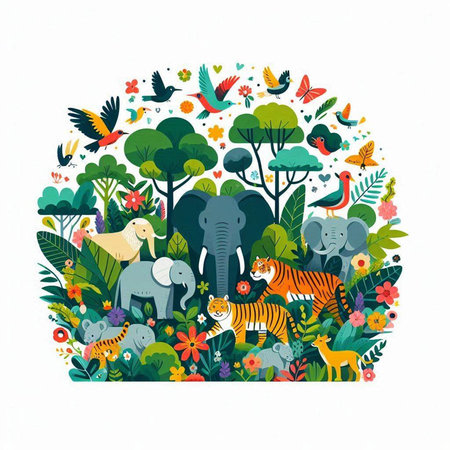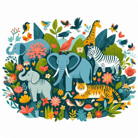 Vector illustration of wild animals in the jungle with flowers and plants.