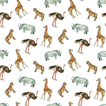 Seamless pattern. Animals of Africa: giraffe, rhinoceros, spotted hyena, ostrich, monkeys hand-painted in watercolor. Suitable for printing on fabric and paper, for the design of books and magazines.