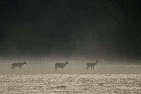 A majestic stag stands silhouetted against a misty forest backdrop at dawn. The soft light filters through trees, creating a serene and tranquil atmosphere.