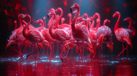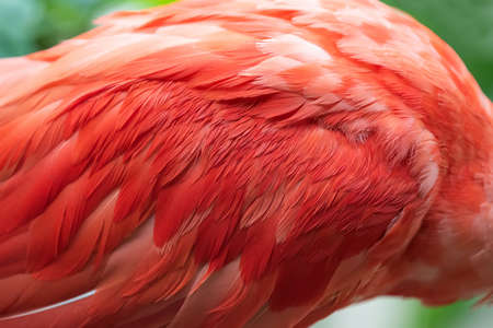 A group of flamingoes. Pink flamingos against green background. Phoenicopterus roseus, flamingo family.