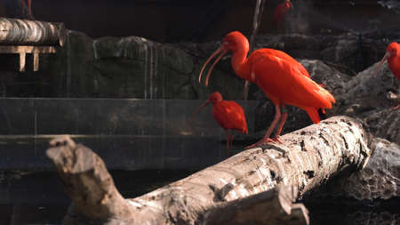 Scarlet red ibis or Eudocimus ruber is national bird of Trinidad and Tobago. Animal and bird park in Walsrode, Germany