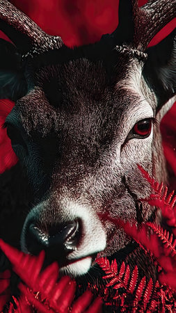 Close-up of an injured red deer stag standing in ferns during rutting season in autumn, UK.