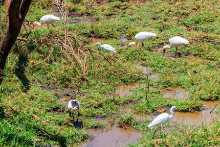 White Egret wading in the dry river and hunting.Great Egret looking for fish in rice field thailand.