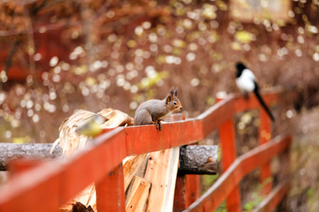 Squirrel in the autumn park. Red gray squirrel portrait close up