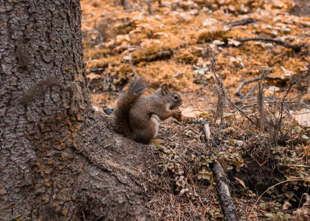 Squirrel eating nut. Small funny squirrel sitting on ground and holding and eating nut. Canadian Rocky Mountains. Banff National Park. Alberta. Canada.