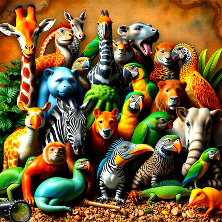 This image presents a collage of various wildlife animals. It showcases a lion, fox, parrot, bear, dolphin, and owl. The composition features diverse textures, including fur, feathers, and scales. The animals are set against natural backgrounds, suggesting an outdoor environment. This visual is suitable for commercial and editorial purposes.