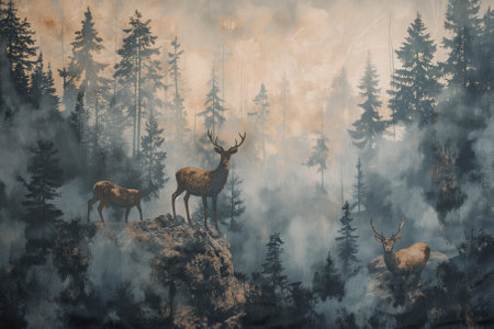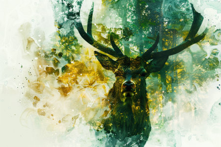 Deer silhouette with a watercolor forest background, creating a tranquil nature scene