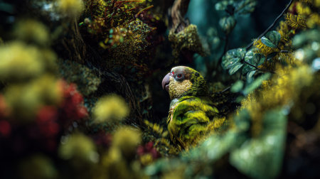 A stunning portrait of a vibrant tropical bird nestled among lush greenery and colorful flora, highlighting nature's beauty and diversity.