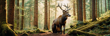 Panoramic view of a male deer with antlers in the forest