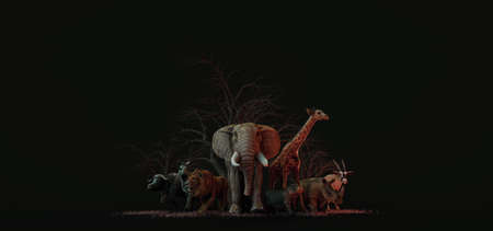 large group of wild zoo ,various wild animals including buffalo, zebra,lion, elephant,giraffe,rhinoceros,hippopotamus and deer under the dried tree on black background, 3d and illustrator