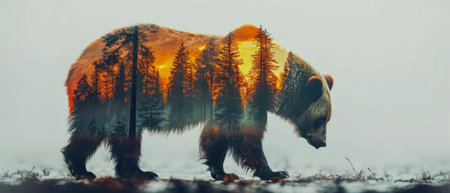 Double exposure of a wild brown bear and a pine forest