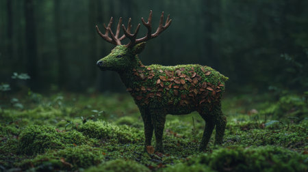 Moss-covered deer statue in a lush forest