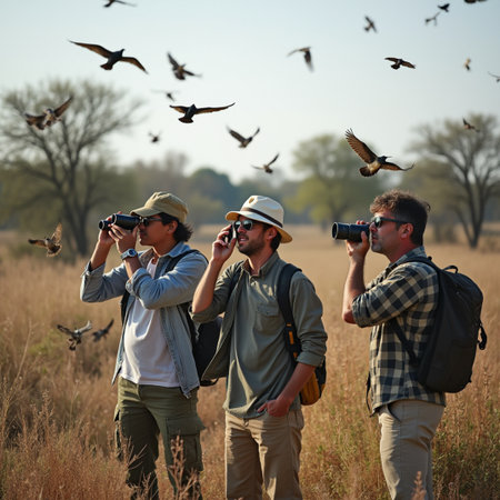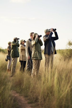 Defocused group of nature lovers huddled together binoculars in hand in the midst of a beautiful meadow