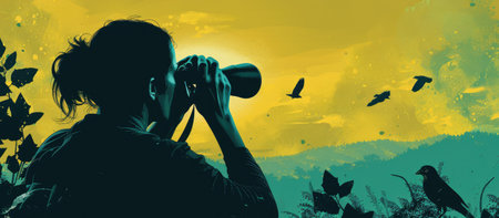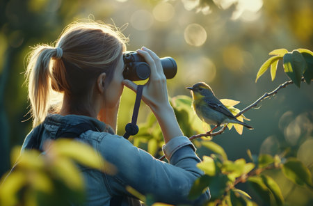 A peaceful moment captured in a nature reserve, with a person quietly observing wildlife through binoculars, underscoring the beauty of coexisting with nature and the importance of protected areas.