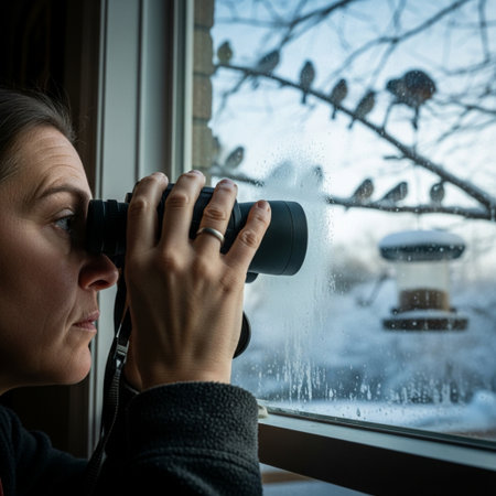 Low-angle, candid editorial photograph capturing a bird enthusiast indoors, using binoculars pressed