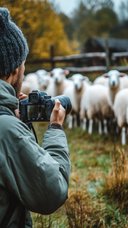 A person is photographing a group of sheep on a green hillside. The cloudy sky creates a serene atmosphere while nature surrounds the scene, making it an idyllic countryside moment.