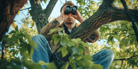 Young man looking through binoculars sitting on a tree in the park