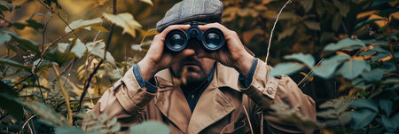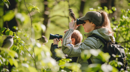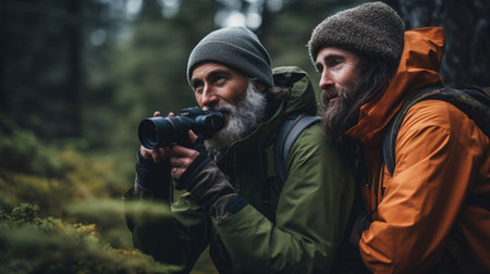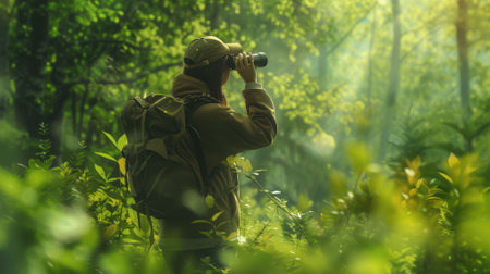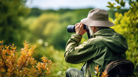 The picture of the bird watcher that has been searching for the birds with the binocular in the forest, the bird watcher require patience, knowledge of bird habits and the ethical awareness. AIG43.