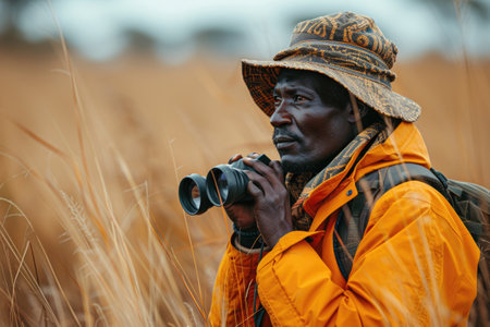 A man in vibrant orange attire with a patterned hat observes the savannah through binoculars, immersed in the wilderness. zoologist