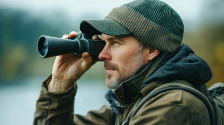 man with binoculars looks at the river