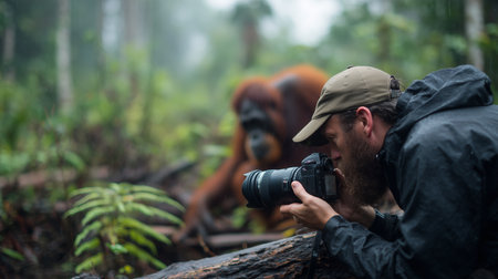 Man takes picture of orangutan in forest during rainy weather